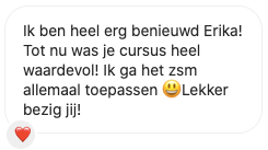 Ik wist echt helemaal niks, maar wilde in ieder geval de basiskennis gaan beheersen. Dit is na 1 dag al gelukt en als ik nog vragen heb kan ik Erika altijd contacten of zelfs inschakelen voor wat grotere klussen die ik zelf niet wil of kan uitvoeren. Dit zal ik ook zeker doen, omdat ik Erika een heel prettig persoon vindt en graag samenwerk met andere ondernemers waar ik een klik mee heb.