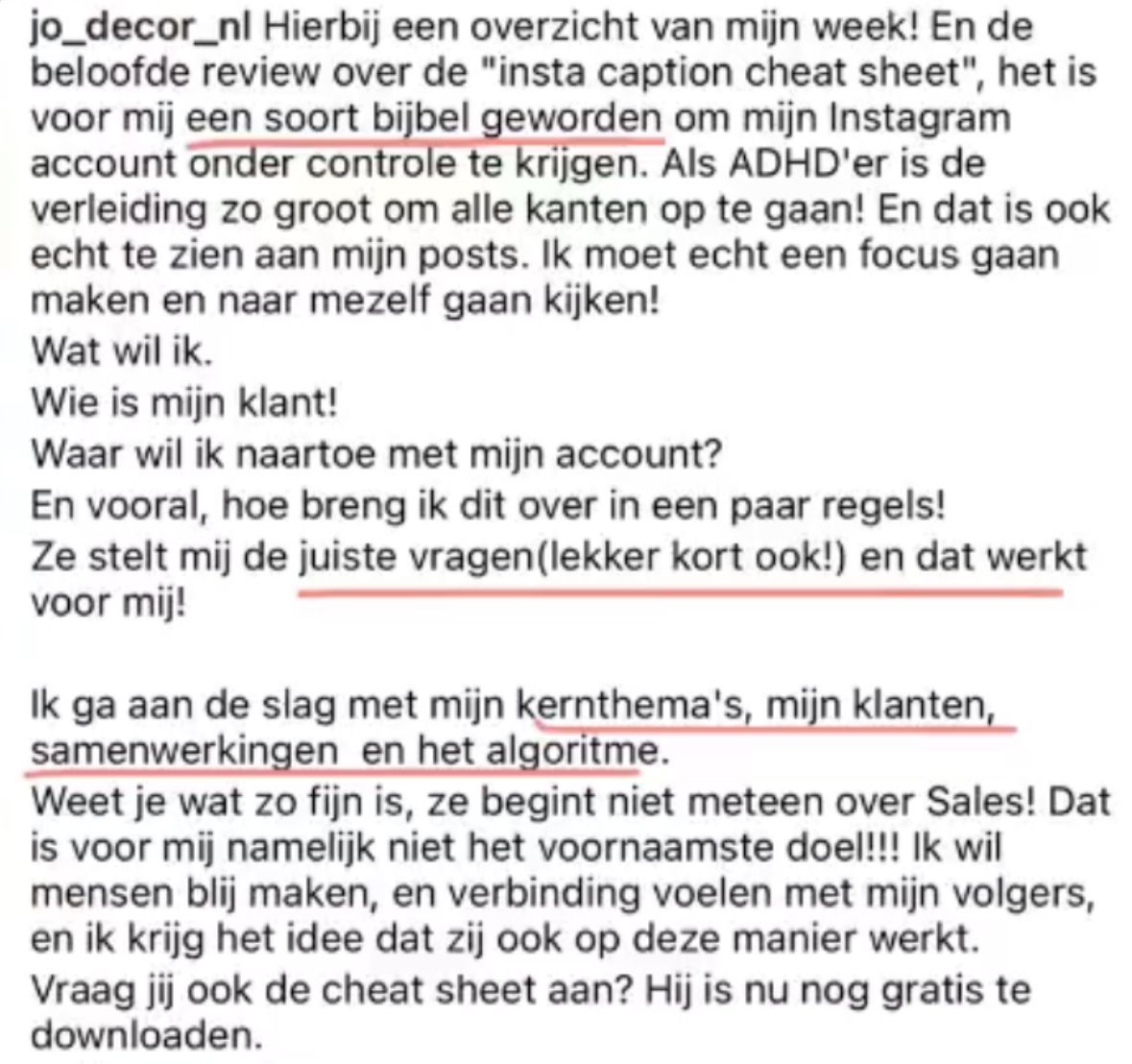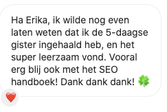 Omdat Erika een goede voorbereiding heeft getroffen, konden we direct aan de slag op de dag zelf. Met het zoekwoordenonderzoek en toevoegingen gericht op mijn bedrijf, had ik gelijk enorm veel informatie waar ik ook echt iets mee kon doen tijdens de livedag. Ook heeft Erika na deze dag een aftercare, waar ik al mijn to-do's die ik tijdens de livedag heb opgeschreven, nogmaals met haar kan bespreken.